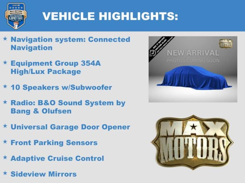 10 Speakers w/Subwoofer, 360-Degree Camera, Adaptive Cruise Control, Additional Sound Deadening, Equipment Group 354A High/Lux Package, Evasive Steering Assist, Front Parking Sensors, Heated Steering Wheel, Information on Demand Panel, Navigation system: Connected Navigation, Radio: B&O Sound System by Bang & Olufsen, Sideview Mirrors, Universal Garage Door Opener, Wireless Charging Pad.
