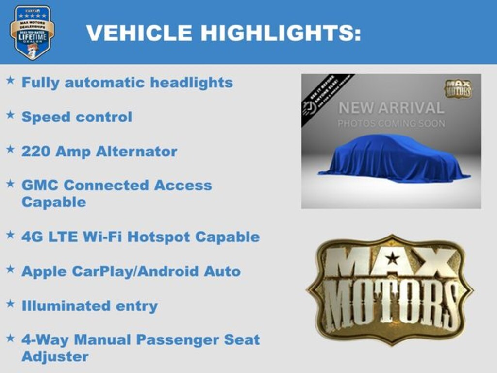 10-Speed Automatic, 4WD, Cloth, 220 Amp Alternator, 4-Way Manual Driver Seat Adjuster, 4-Way Manual Passenger Seat Adjuster, 4G LTE Wi-Fi Hotspot Capable, Alloy wheels, Apple CarPlay/Android Auto, Exterior Parking Camera Rear, Front 40/20/40 Split-Bench Seat, Front Frame-Mounted Black Recovery Hooks, Fully automatic headlights, GMC Connected Access Capable, Heavy Duty Suspension, Illuminated entry, Keyless Open & Start, Premium audio system: GMC Infotainment System, Remote keyless entry, Remote Vehicle Starter System, Speed control, Split folding rear seat, Steering wheel mounted audio controls, Variably intermittent wipers.